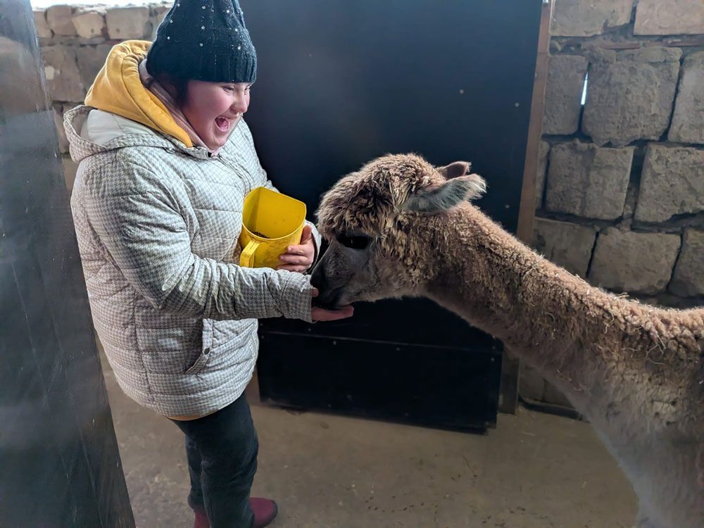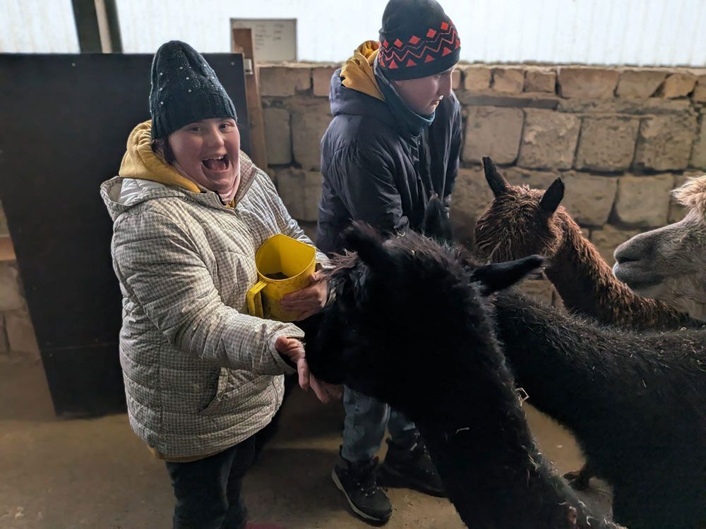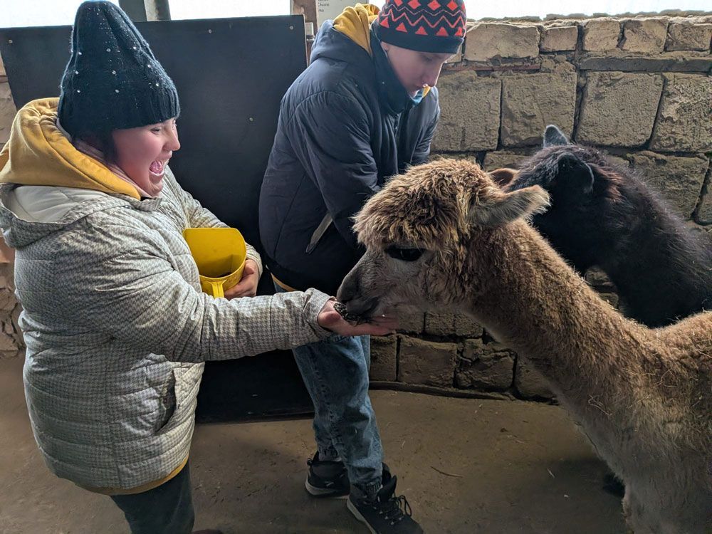 Zwei Kinder füttern ein Alpaka aus einer grünen Schüssel